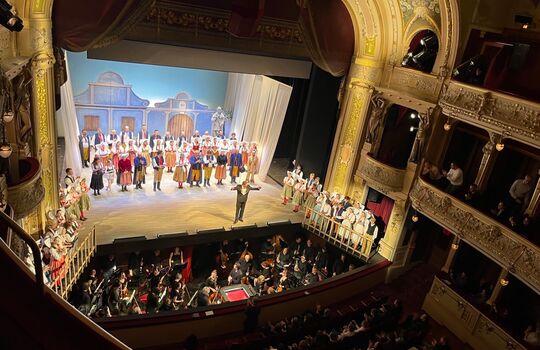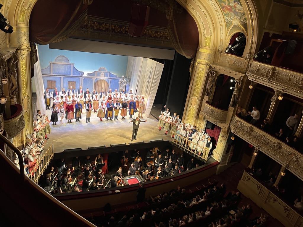 Während der Busfahrt las uns Laura Wilde die Handlung vor. Hier nur die Kurzfassung: Die Geschichte spielt in einem Dorf in Böhmen im 19. Jahrhundert. Die Eltern entscheiden selbst nach der Geburt ihrer Kinder über deren zukünftige Hochzeit. Nur die List und Schlauheit von Jeník tragen zum Ende der Oper dazu bei, dass er seine geliebte Mařenka bekommt. Anschließend hörten wir uns noch im Bus gemeinsam eine Aufnahme des Chores „Proč bychom se netěšili“ an, den wir in der Aufführung von unseren Plätzen aus mitsingen durften!