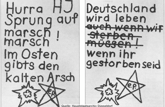 Schon äußerlich an den längeren Haaren sich von den „Kindern des Führers“ zu unterscheiden führte unweigerlich zu Straßenschlachten und Massenprügeleien mit der gleichgeschalteten Jugend, was wiederum die Kriminalpolizei, also die SS und die Gestapo auf diese Freigeister aufmerksam werden ließ. Nun entwickelten die „Edelweißpiraten“ zunehmend politisches Bewusstsein und drückten ihre Unzufriedenheit aus mit nachts im Untergrund gedruckten und heimlich verteilten Flugblättern oder mit an die Häuser oder Bahnstrecken geschmierten Parolen, an denen die Nachschubzüge für die Wehrmacht vorüberfuhren. Dazu sammelten sie auch die von englischen Bomberpiloten abgeworfenen, in deutscher Sprache zum Widerstand gegen die Waffenindustrie aufrufenden Flugblätter ein und steckten diese -trotz angedrohter Todesstrafe - nachts in die Briefkästen. Ihre handwerklichen Kenntnisse nutzten die Widerstandskämpfer auch, um große, mit Waffen beladene Güterzüge entgleisen zu lassen. Einige Jugendliche gaben sich ganz ihrem Kampf im Untergrund hin, bewaffneten sich und führten auch Sprengstoffanschläge aus. Dies konnte nicht ohne Folgen bleiben. Viele Edelweißpiraten wurden gefasst, geschlagen und unter Folter verhört. Das KZ Mooringen im heutigen Niedersachsen überlebten kaum einige der jungen Menschen. In Köln – Ehrenfeld wurden zur Abschreckung vor den Augen der Eltern z.B. ein 16-Jähriger öffentlich hingerichtet. Heute ist die Kölner Gestapozentrale ein Dokuzentrum, in dem die Aufarbeitung der NS-Vergangenheit versucht wird.