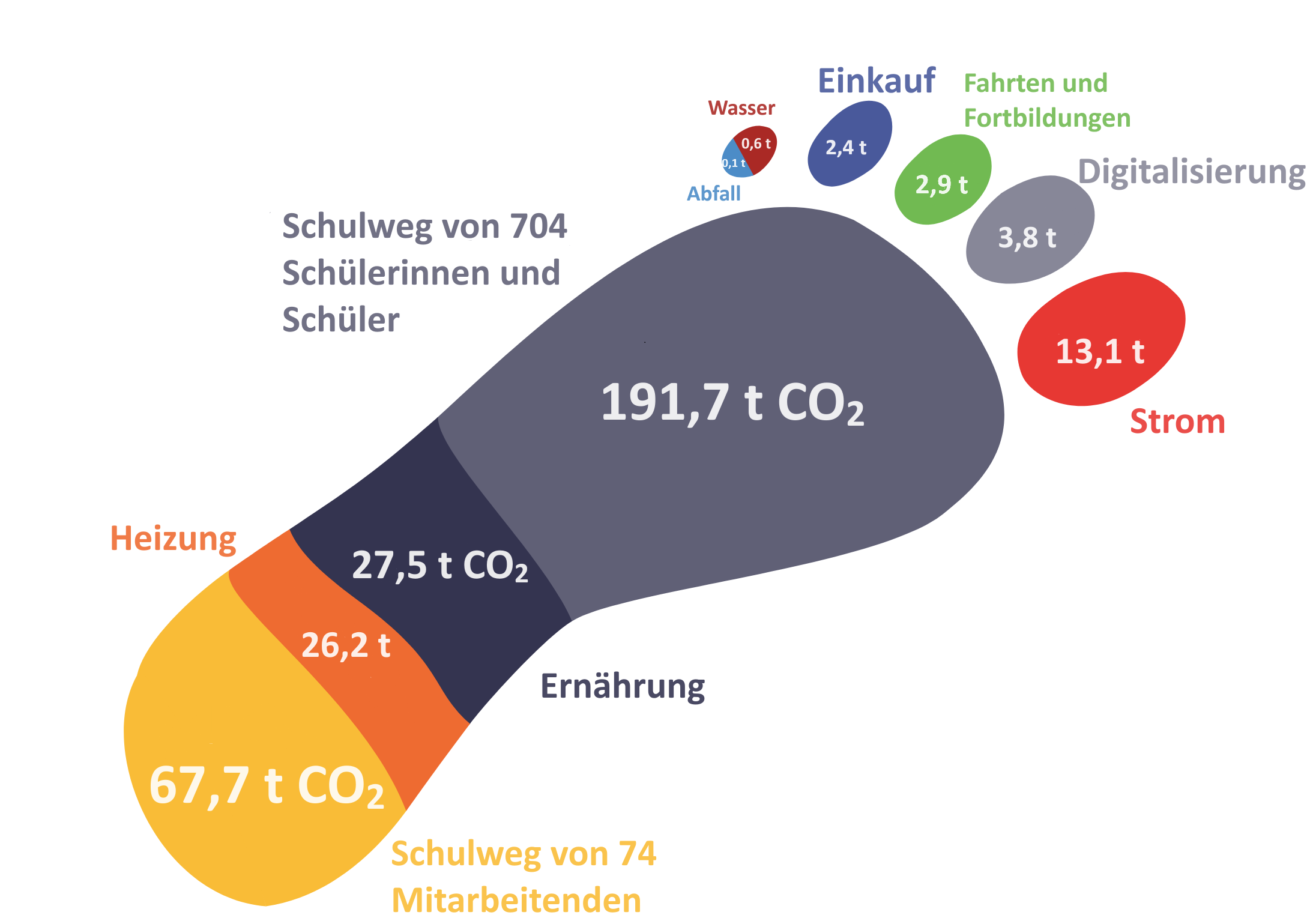 Auf der Grundlage dieser Daten wurden bestehende Maßnahmen gesammelt und fortgeführt und neue Maßnahmen überlegt, um in den acht Bereichen Abfall, Einkauf, Ernährung, Kommunikation und Vernetzung, Kompensation, Mobilität, Strom und Wärme den ermittelten Ausstoß zu reduzieren. Daraus resultierten gewinnbringende Maßnahmen, wie zum Beispiel eine Kleidertauschbörse, eine Baumpflanzaktion, das Schul- und Stadtradeln mit knapp 1000 Teilnehmerinnen und Teilnehmern in der Marktgemeinde Regenstauf und viele mehr. Durch die zahlreichen Schritte wurde bei den Schülerinnen und Schülern ein Bewusstsein für das eigene Handeln entwickelt und somit in der Schule und im häusliche Umfeld die Bildung für nachhaltige Entwicklung vorangetrieben.
