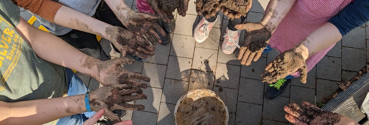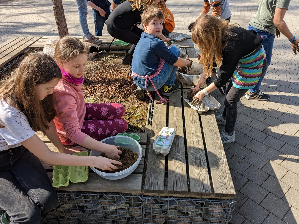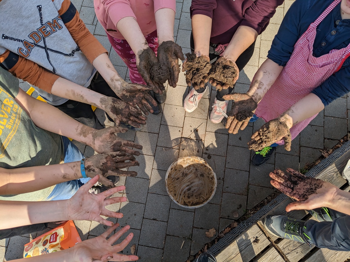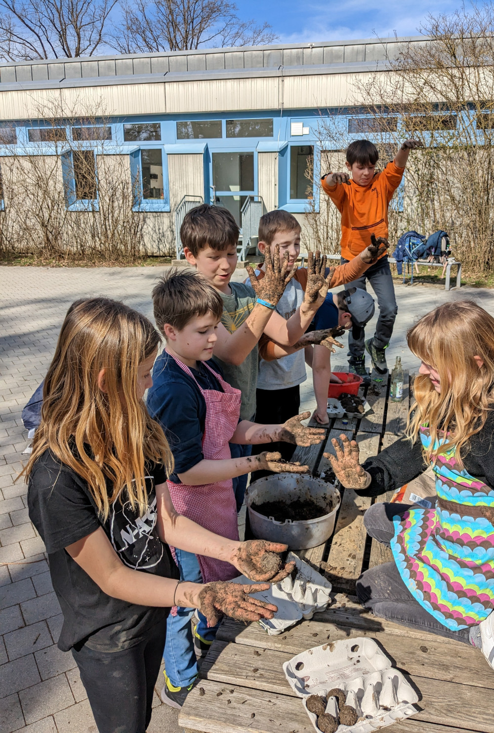 Und so wurden bei schönstem Wetter mit Erde, Blumensamen, Tonerde und Wasser sogenannte Seedbombs gebaut. Diese durften die Kinder zum großen Teil mit nach Hause nehmen, um dort ihre Umgebung mit bunten heimischen Blumen zu verschönern.